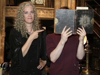 Edith Bowman a skrytý (opuchnutý) Daniel Radcliffe v knižnici u Malfoyovcov